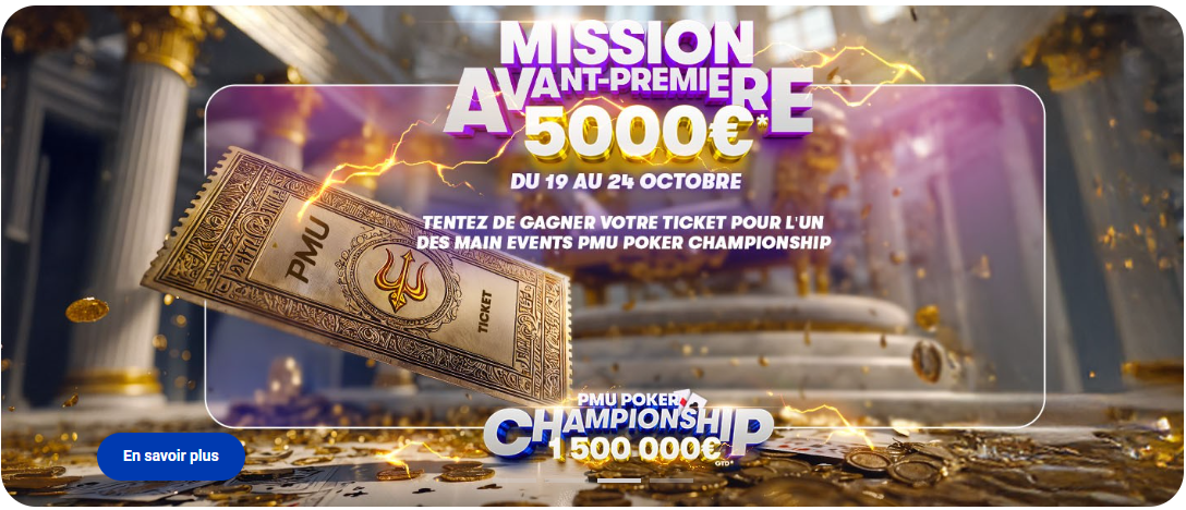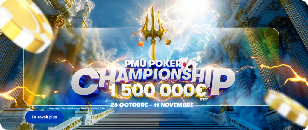 De quoi bien vous préparer à cette superbe series ! Dès le 26 octobre, vous pourrez entrer dans l’arène et prendre une part des 1 500 000€ garantis sur l’événement. Le PMU Poker Championship, c’est plus de 300 events, le retour de non pas une mais deux SuperCrown, une mission spéciale, des Leaderboards quotidiens, des Twisters dédiés, et bien plus encore…