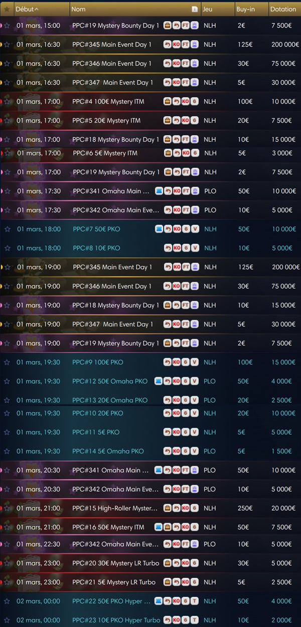 3 Main Events Hold’em seront notamment au programme en format flight avec une multitude de Day 1 (à 19h & 22h en semaine, et à 16h30 en plus les dimanches) à partir du 1er mars, déclinés en 3 niveaux de buy-in pour s’adapter à toutes les bankrolls :