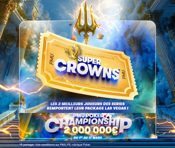 Grâce aux Super Crowns, les 3 premiers des classement High et Low se verront offrir chacun un package ou ticket Live. Le classement High comprend l’ensemble des tournois aux buy-ins de 20€ et +, et le classement Low comprend l’ensemble des tournois aux buy-ins de 10€ et –. A chaque fois que vous remportez un tournoi PMU Poker Championship, – hors satellites et freerolls – vous remportez 1 point pour le classement correspondant au buy-in du tournoi joué.