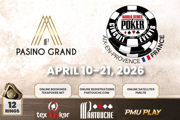 Les World Series of Poker Circuit sont de retour au Pasino Grand d’Aix-en-Provence du 10 au 21 avril 2026 avec le Groupe Partouche, Texapoker et PMU PLAY comme partenaire en ligne. Au programme, 12 bagues WSOPC…