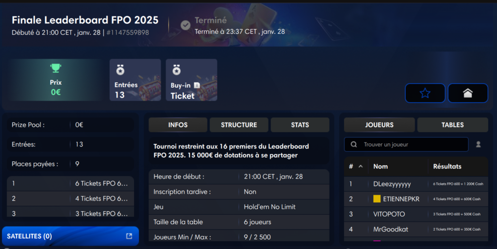 A noter d’ailleurs que nos 2 poulains ont respectivement terminé 1er et 2e de la Finale Online (et ses 15 000€ de dotations offerts par PMU Poker & Texapoker) le mercredi 28 janvier dernier : Antoine Berruel remportant le Package FPO d’une valeur de 4 800€ pour jouer « en Freeroll » notamment tous les Main Events de la saison 2026 et EtiennePKR 4 Tickets FPO 600 + 600€ Cash !