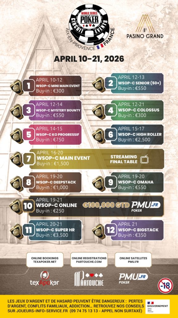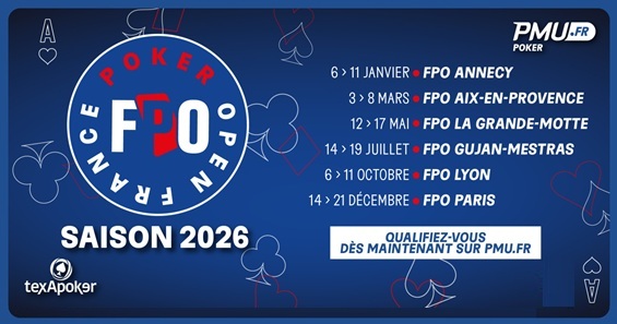 Déjà Partenaire Exclusif de Texapoker pour le Championnat de France de Poker qui aura lieu du 13 au 26 octobre au Pasino Grand d’Aix-en-Provence, PMU Poker le sera aussi sur le nouveau Championnat des Régions de Poker avec 35 000€ de dotations qui seront offertes sur les 6 étapes 2026 !