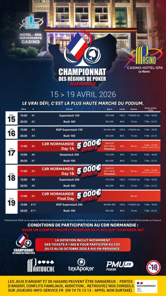 Infos et réservations pour le CdR Normandie (15 au 19 avril) : https://www.texapoker.net/fr/tournois-poker-live/le-havre-championnat-des-regions-de-poker_3070.html