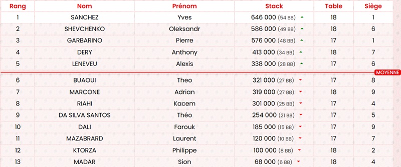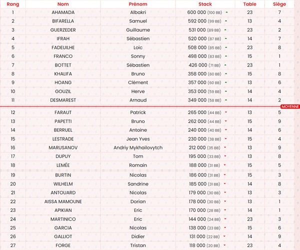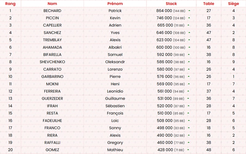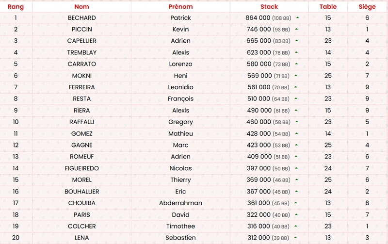 Et ce Jour 1 se terminera avec 20% des Joueurs restants (et environ 13,5% seront ITM au Jour 2).