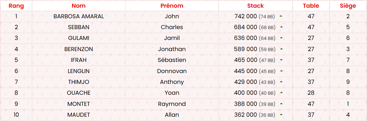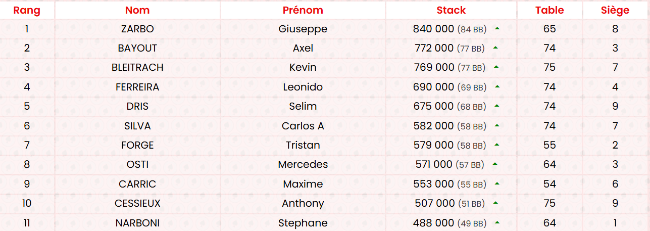 Timothée Colcher, Tom Dupuy et Heni Mokni sont les derniers qualifiés PMU.fr à avoir pris place dans ce Jour 1A en compagnie d’un ancien Qualifié Las Vegas Experience Fabrice Manel, alors que le vainqueur du dernier FPO La Grande-Motte Julien Montois est passé par la case re-entry. On retrouve également dans le field les Parisiens Mercedes Osti et Philippe Ktorza ou encore l’ambassadeur du Pasino Grand Sonny Franco.