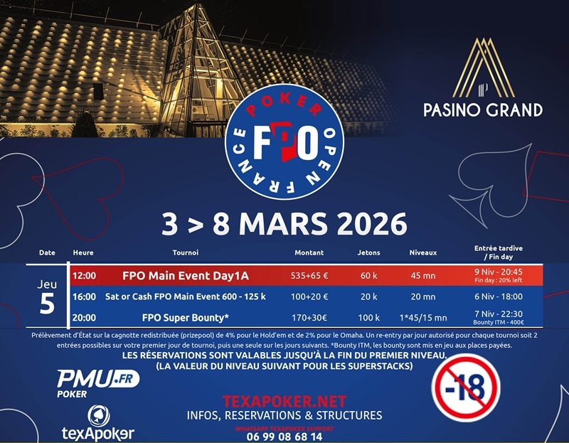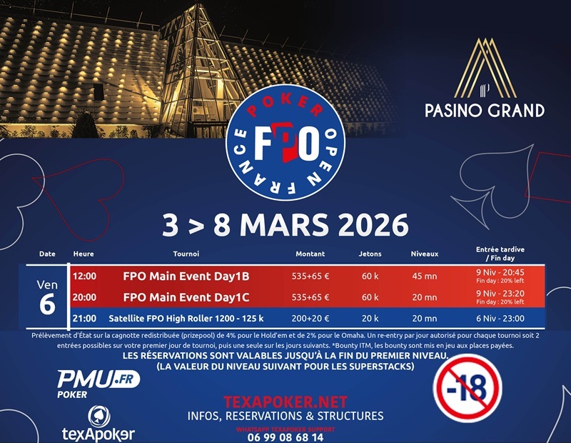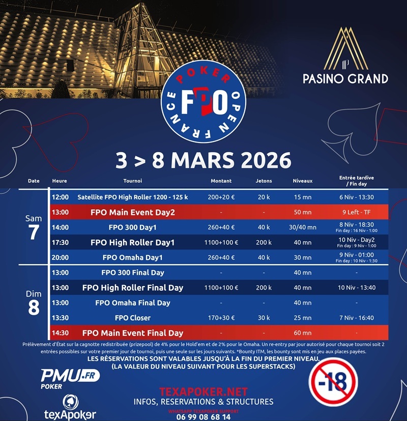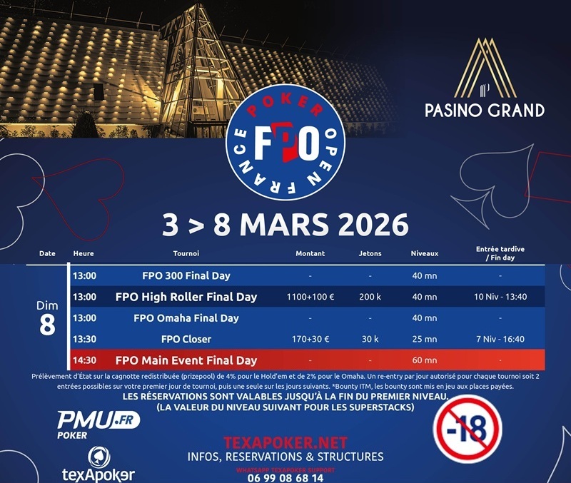 Jeudi 5 mars – C’est à 12h que débutera le Jour 1A de ce Main Event du circuit France Poker Open par PMU en partenariat avec Texapoker au Pasino Grand d’Aix-en Provence.