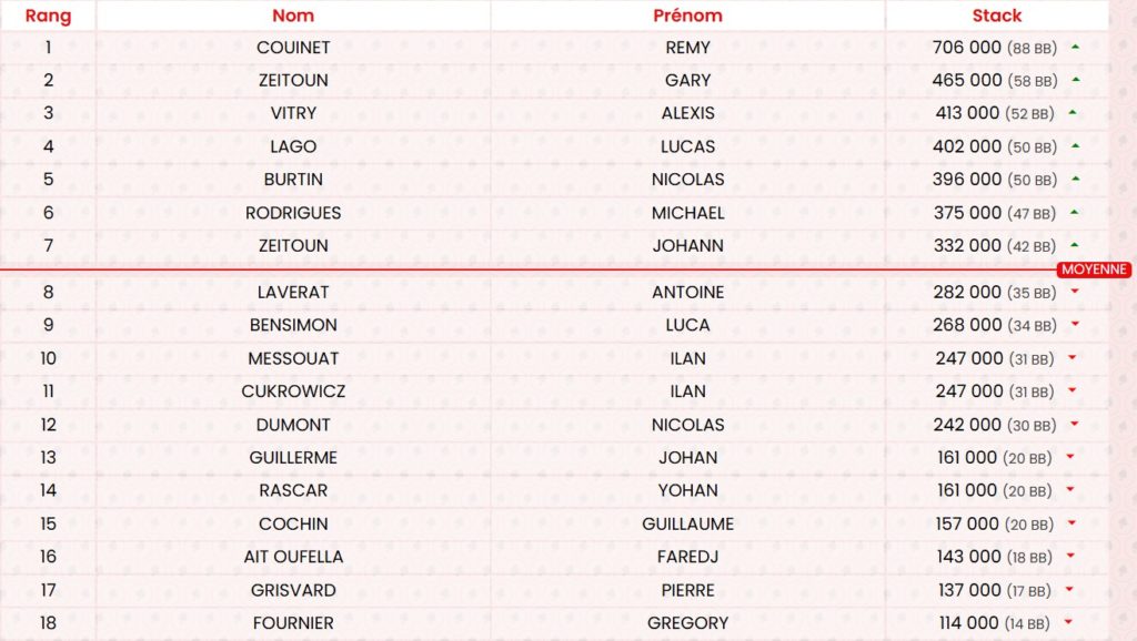 Et ce Jour 1 se terminera avec 20% des Joueurs restants (et environ 13,5% seront ITM au Jour 2).
