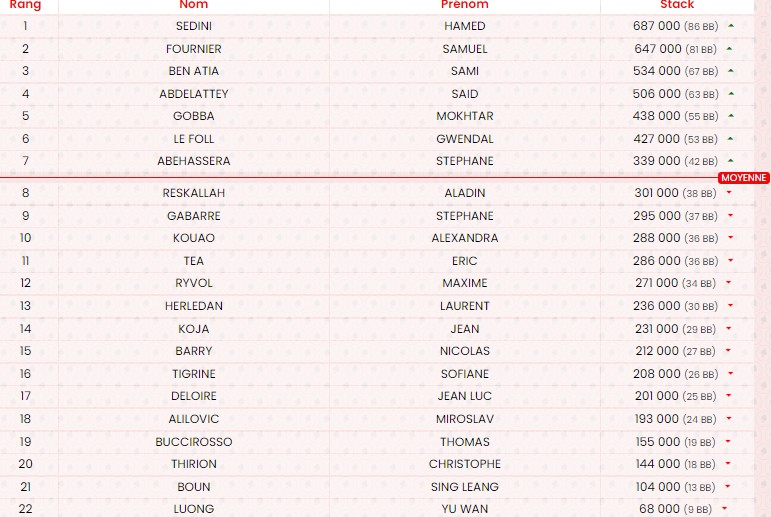 Niveau 7 – Blindes 600/1 200/ ante BB 1 200 – Moyenne 91 100 – 83 restants / 126 entrants