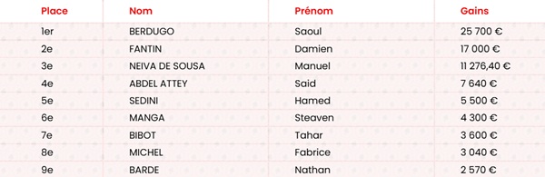 | 9 | SAINT AMAND 2025 | 382 | MARICAL Sebastien | 40 000 € | 45 | BARKA Samy | 18 700 € |