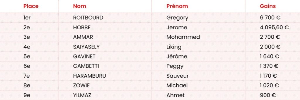1er Hassani Djamel 6 800 €