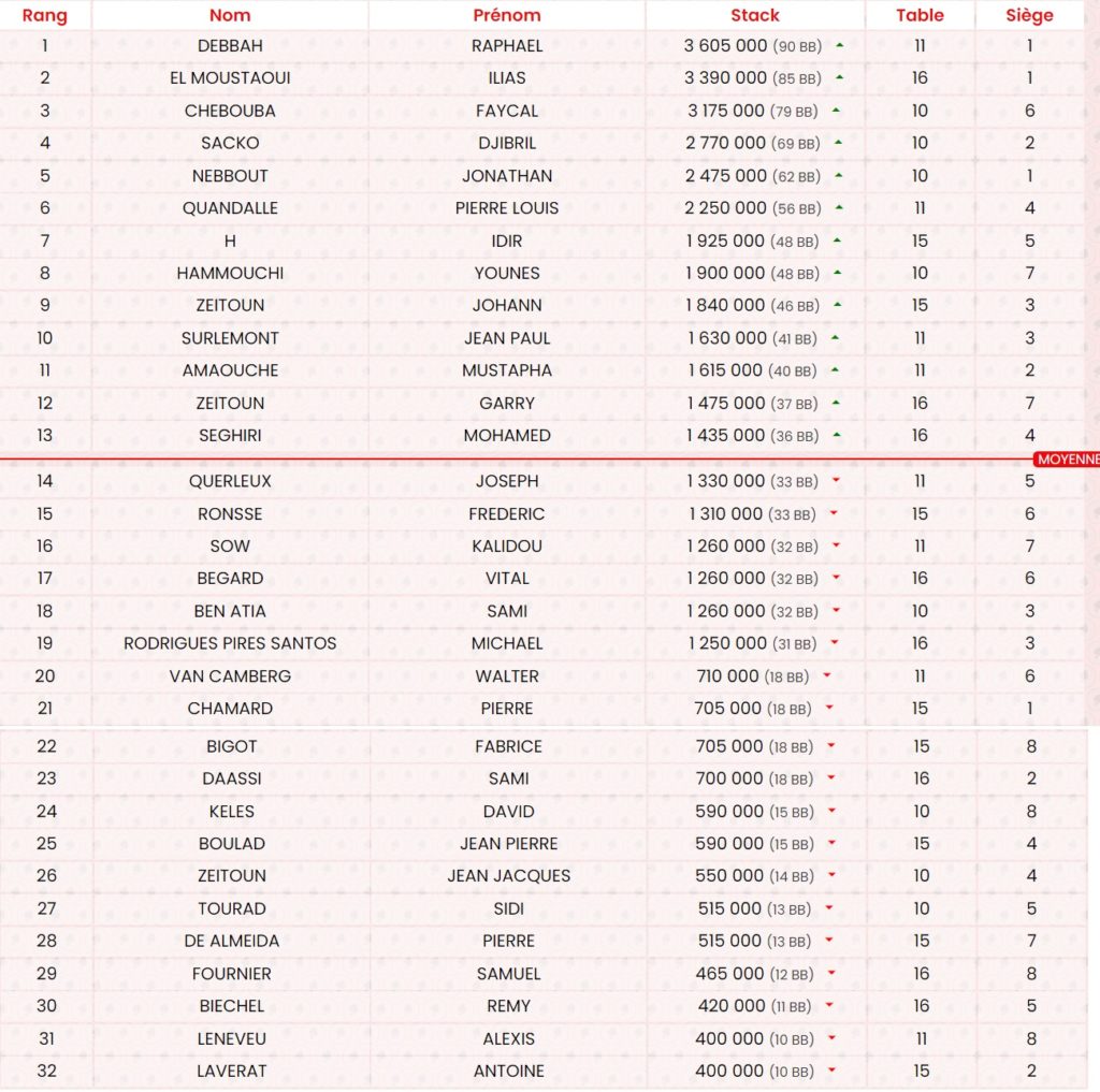 Fin du Niveau 3 – Blindes 200/500/ ante BB 500 – Moyenne 67 600 – 86 restants / 97 entrants