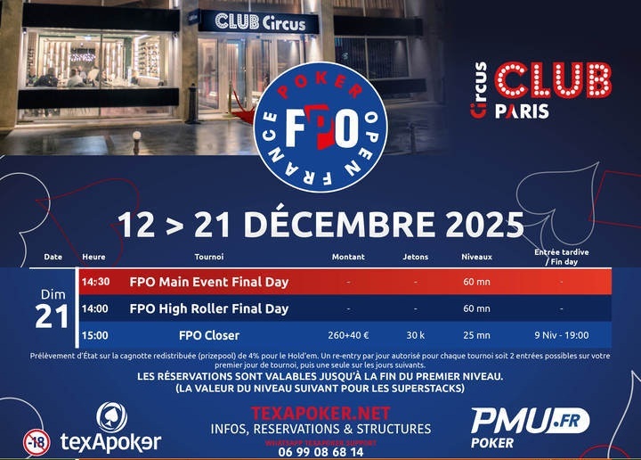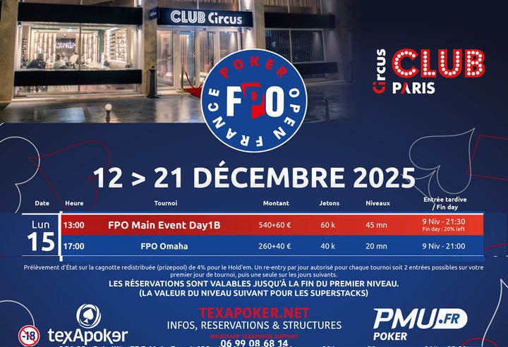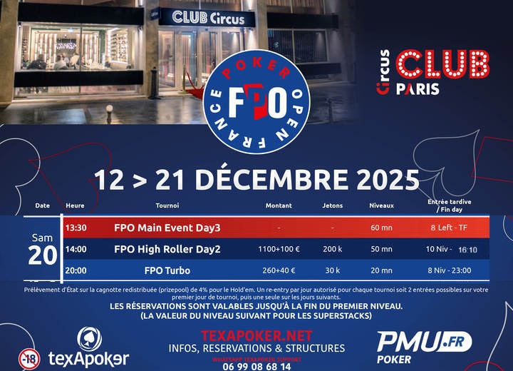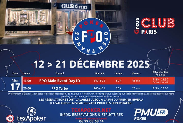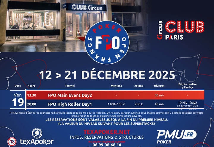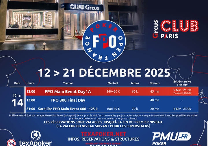 Dimanche 14 décembre – C’est à 13h que débutera le Jour 1A de notre Main Event FPO au Club Circus Paris par PMU Poker et Texapoker, le 1er des 6 Jours 1 au programme de cette dernière étape 2025.